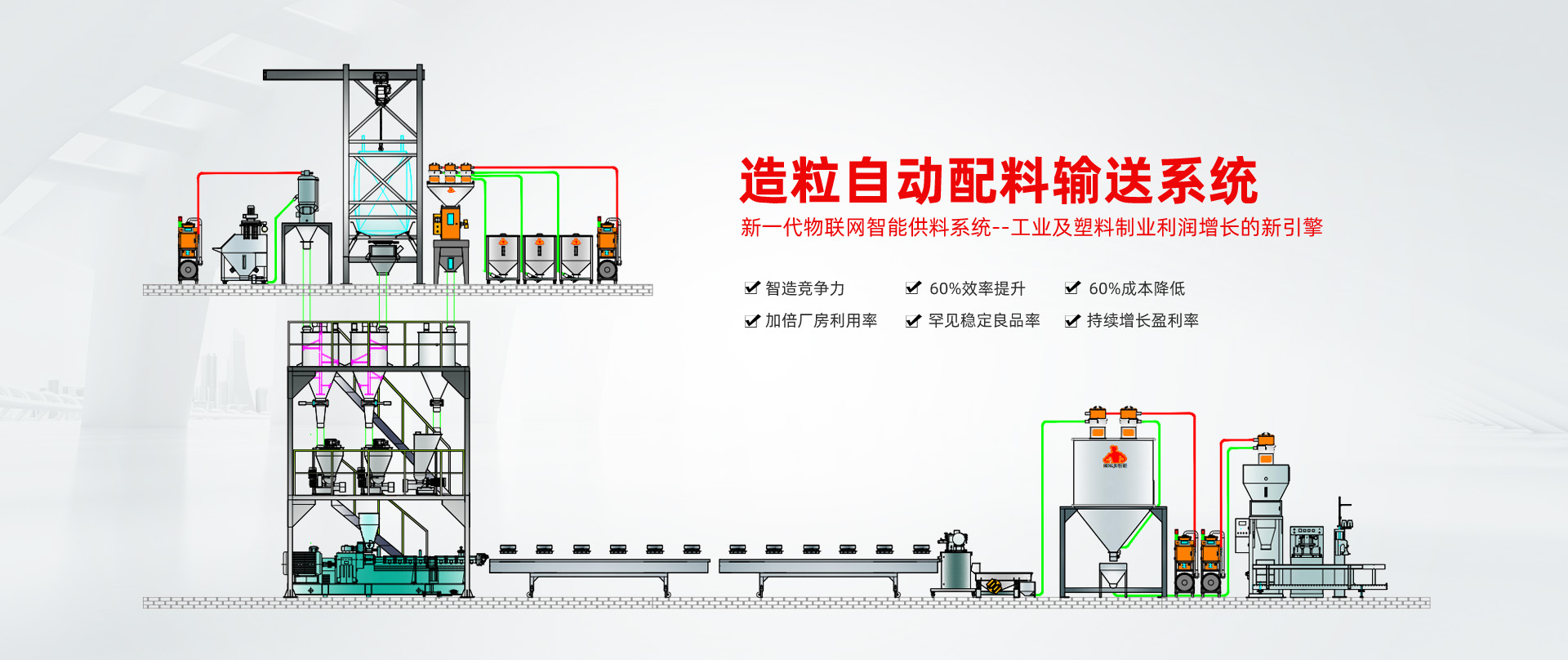 智能化應(yīng)用,更靈活快速安全的聚合物處理,避免原料的浪費和生產(chǎn)損失,中央供料方案的采用實現(xiàn)了能源消耗的優(yōu)化